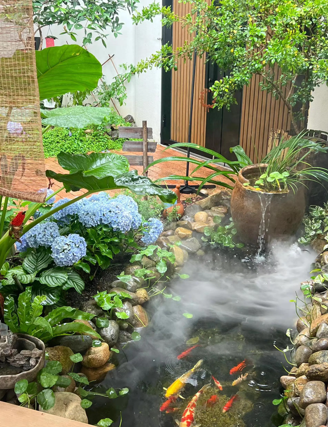 最引人注目的,莫过于那个陶罐流水装置,当喷雾器轻轻喷出细腻的水雾,整个院子仿佛被一层轻纱笼罩,宛如步入了一个远离尘嚣的世外桃源。