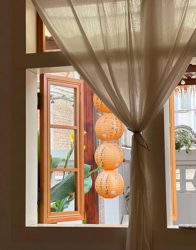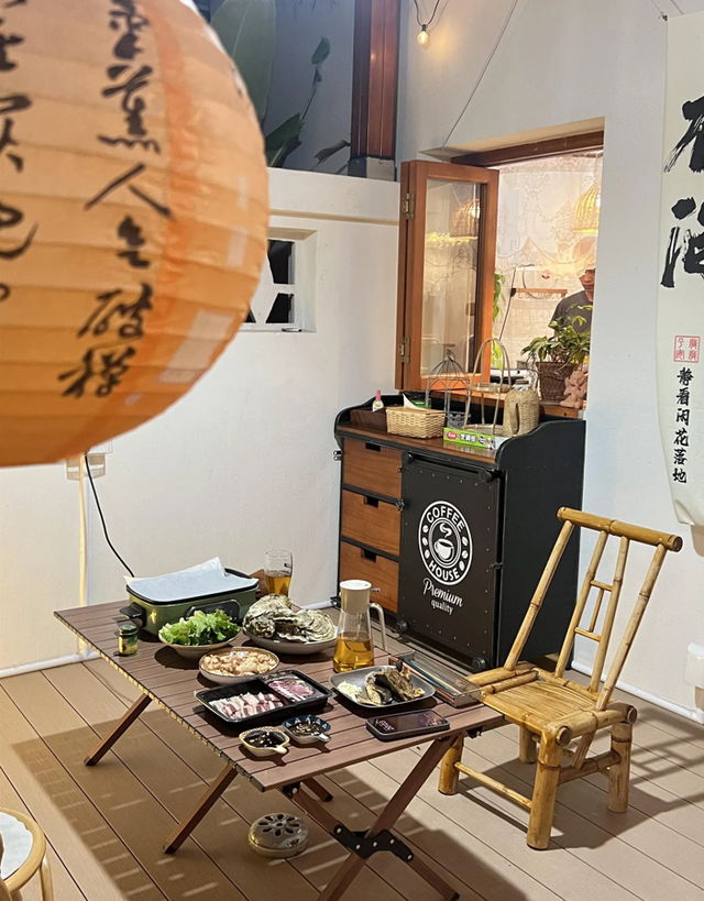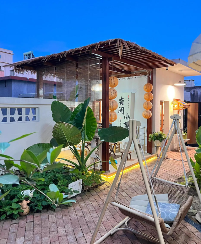 雨棚,这个户外的小天地,用户外木搭建而成,顶上覆盖着稻草,既遮阳又挡雨,再配上几盏古朴的灯笼和随风轻摆的竹帘,让人仿佛穿越回了那个诗意盎然的古代。